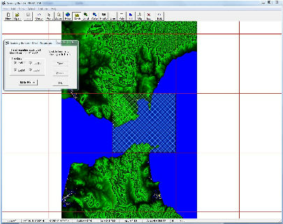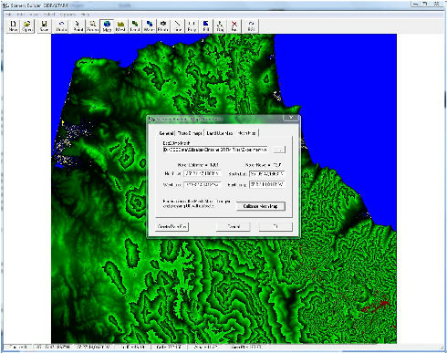 1. Click on SBuilders “Map” tool symbol, then click in the middle of your screen and select your “n35-36w006.bmp” file.  Your map would first be be displayed quite distorted, or in an extremely small size, and SBuilder shows you the message “You may need to calibrate this bitmap!”. Click OK.