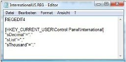 • In case you’re outside the US, your Windows is likely to be set to some kind of Culture using “,” as decimal separator. This might result in a “Compilation Error” when using SBuilders BGL tool, due to the FS SDK tools that SBuilder uses. Iencountered it on my system, but it’s not necessarily the same on your system – just try. If you get the same error message, you have to change your International settings to “US” before compiling. If you do it more often, like I do, you can automate this process by creating REG files (small text files) looking like this ..... and double-clicking it. A second REG file changes the settings back to German (in my case) with a simple double-click after compiling.